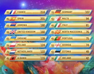 España ha conseguido la máxima puntuación de Estonia, Georgia, Francia e Italia. De hecho, ha sido el país con más máximas puntuaciones junto con Francia. También rompe records con otro dato: es el único país que ha conseguido entrar en el podio actuando en primera posición. El último top 3 de España en Eurovisión Junior fue en 2020 con Soleá y ‘Palante’. Además, es la mejor posición de España desde 2005, cuando Antonio José quedó en segunda posición.